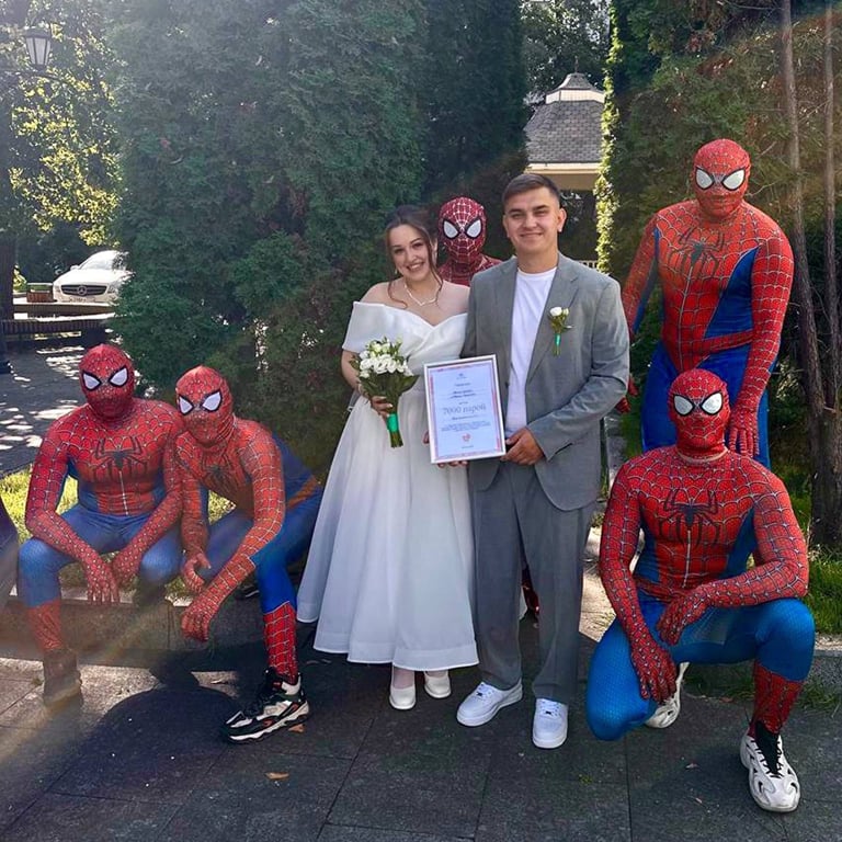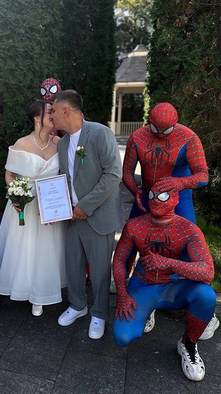 Это знаменательное событие стало особенным благодаря присутствию друзей жениха в костюмах Человека-паука. Все дело в том, что 10 лет назад друзья поспорили, что тот из них, кто первым женится, получит сюрприз от всей компании.