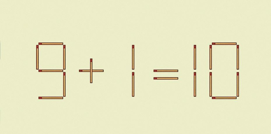 Лишнюю спичку убираем с цифры 18 и перекладываем ее на цифру 3 — получаем: 9+1=10.