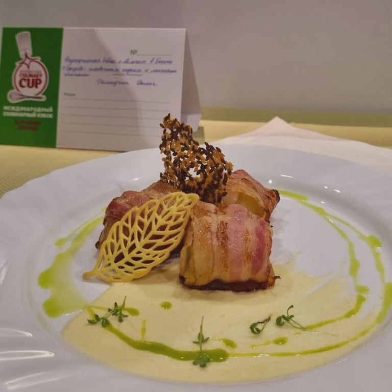 Денис Демидчик удостоен серебра за аутентичное блюдо белорусской кухни. Он приготовил картофельную бабку с яблоком в беконе с березово-сливочным соусом и льняными чипсами.