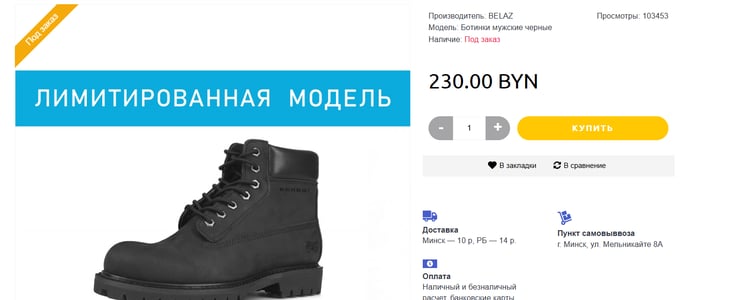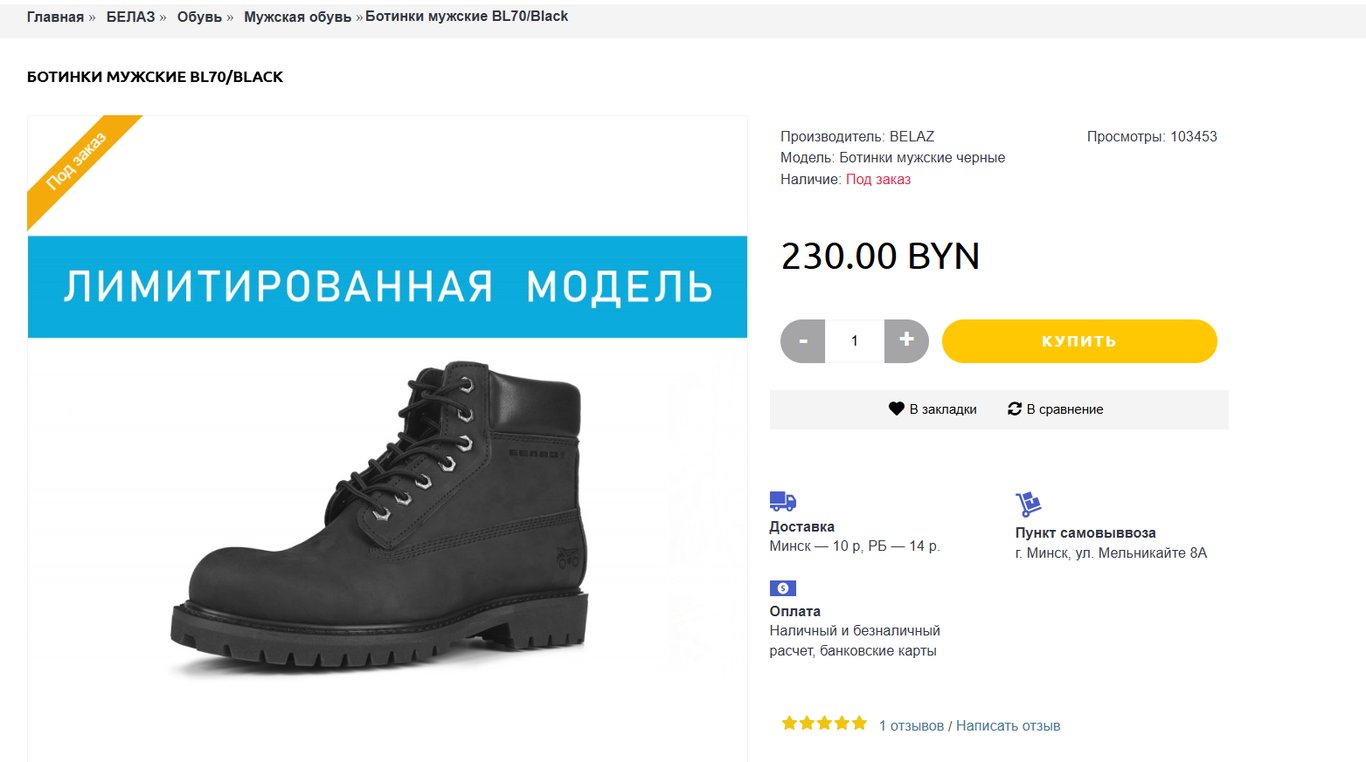 На 20 ноября стоимость ботинок BL70/Black в интернет-магазине сувенирной продукции БЕЛАЗ составляет 230 рублей, приобрести их можно под заказ.