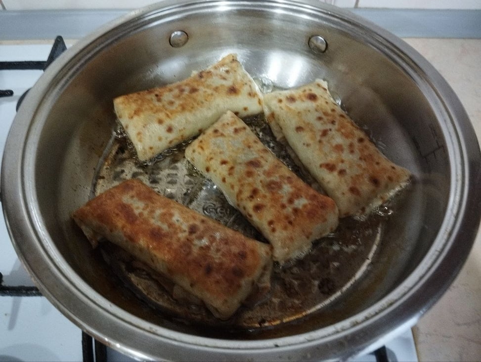 Обжарьте фаршированные блины на сковороде, смешав растительное и немного сливочного масла, до получения хрустящей золотистой корочки.