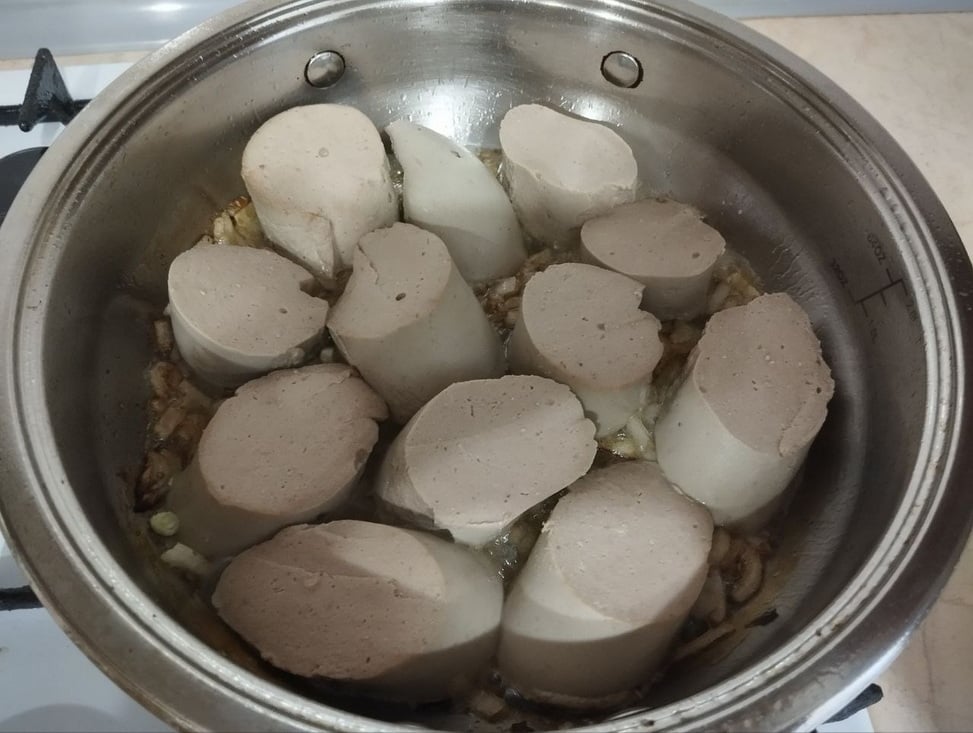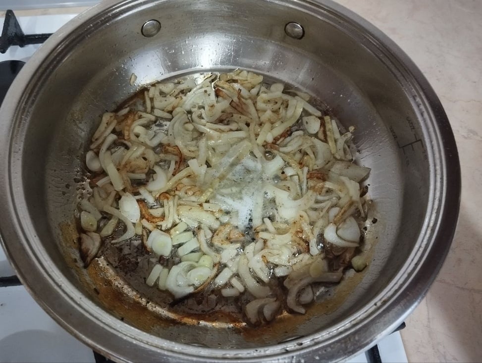 Добавьте нарезанную ливерную колбасу к луку, всыпьте любимые специи и перемешайте. Обжаривайте недолго, чтобы начинка осталась сочной.