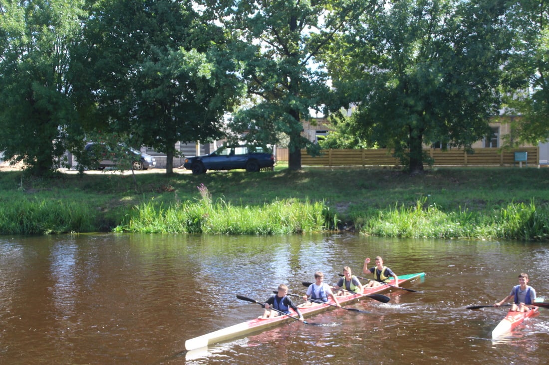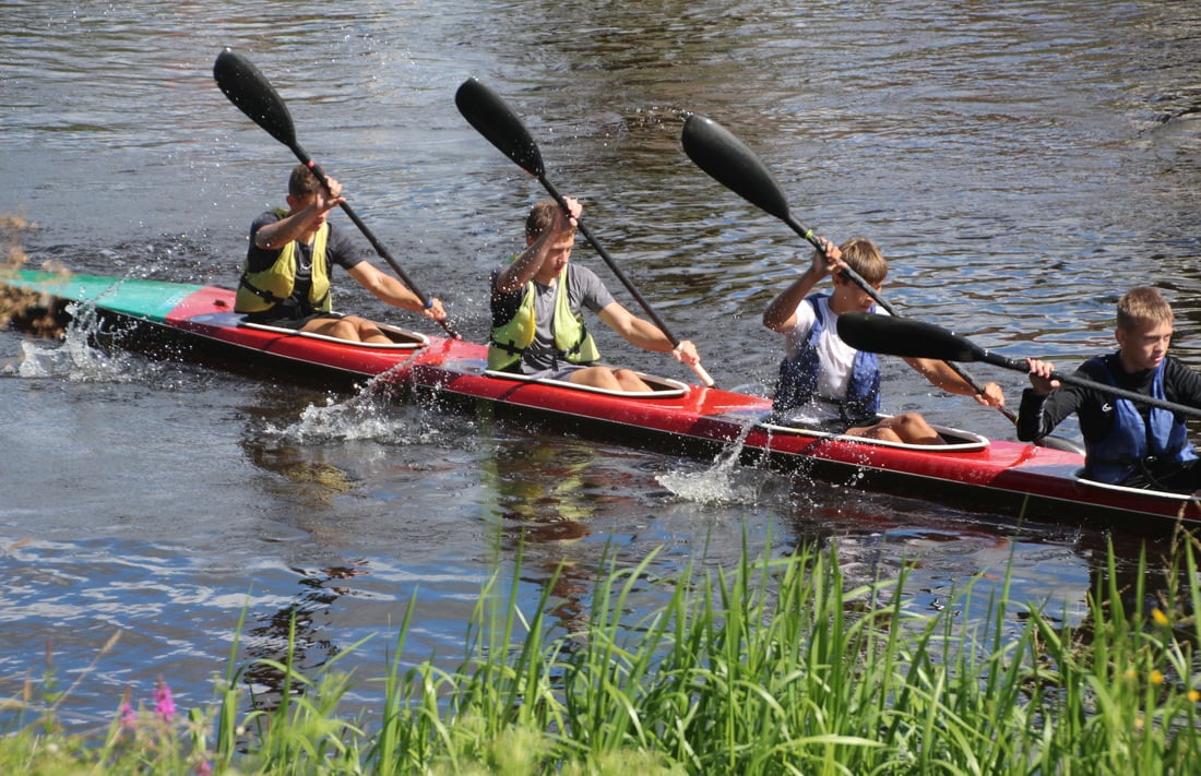 Спокойную гладь реки уверенно рассекают байдарки юных гребцов, которые усердно тренируются, совершенствуя свои спортивные навыки.