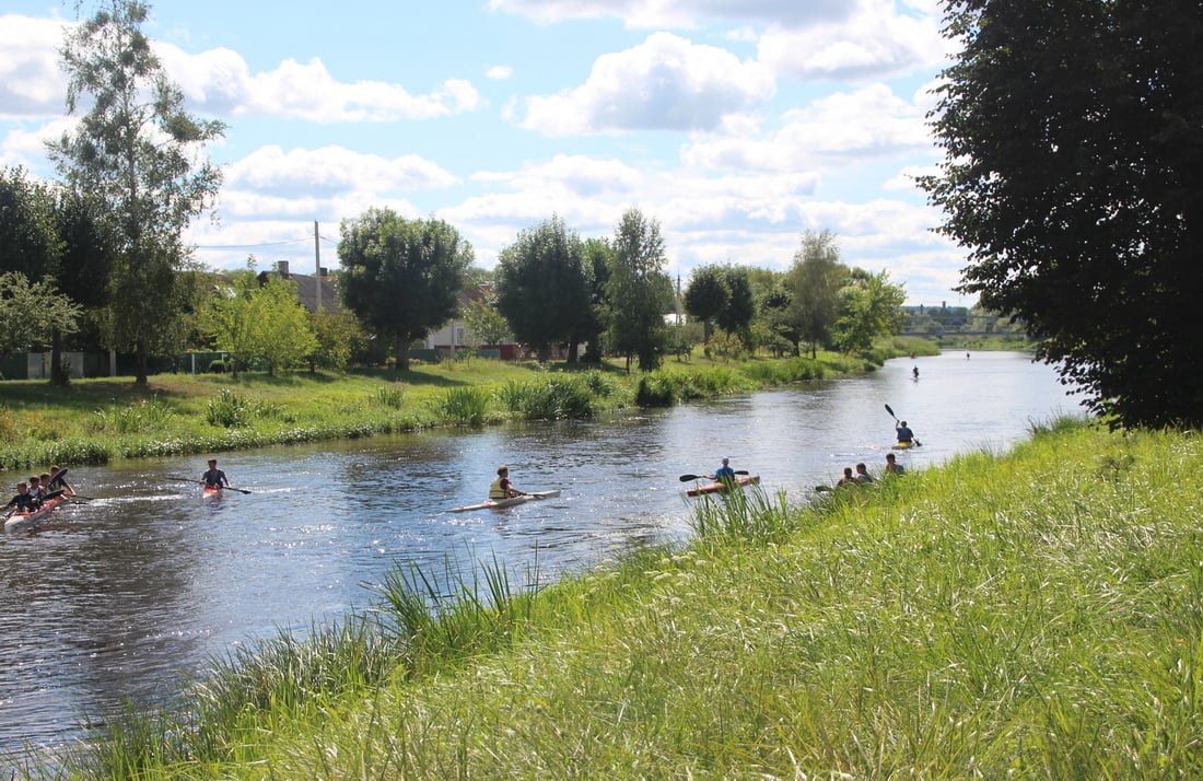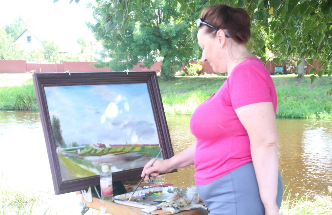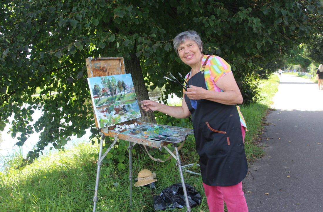 На набережной проходит пленэр. Художники пишут свои картины, вдохновляясь красотой вокруг. Их мольберты стоят недалеко от воды, и мастера аккуратно наносят краски, изображая виды канала. Природа как будто сама просит быть запечатлённой, и каждый мазок передаёт не только красивые пейзажи, но и настроение этого тихого уголка Слонима.