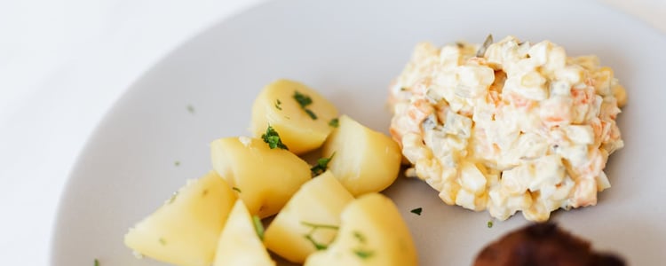 Остывший картофель очистите от кожуры и нарежьте маленькими кубиками.