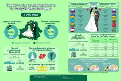 Согласно данным Белстата, в прошлом году в Беларуси зарегистрировали 56 044 новых брака и 33 962 развода. Большинство браков, а именно 86%, заключились в городах, а 14% - в сельской местности. Самые к...