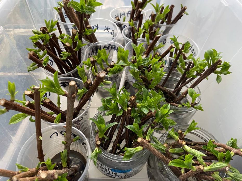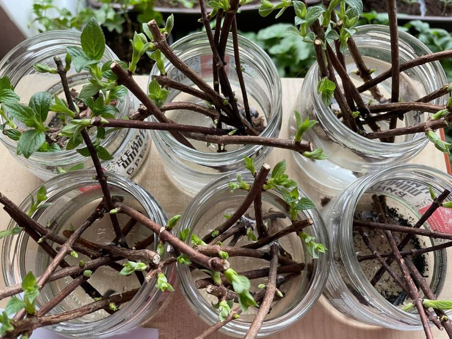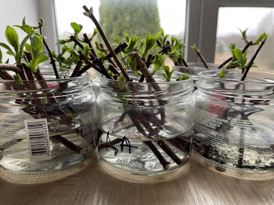 Важно не ставить слишком много черенков в одну банку, чтобы вода могла «дышать». Не забудьте подписать баночки с названием сортов укореняемых гортензий.