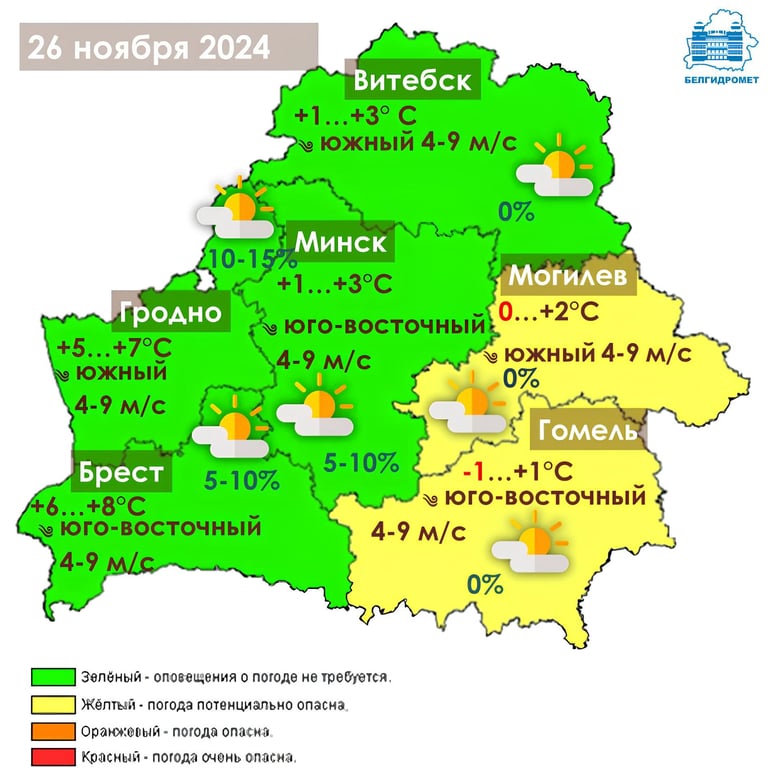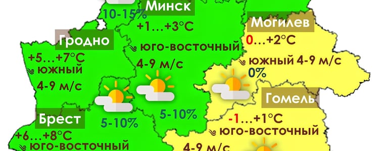 По Гродненской области: Облачно, днем с прояснениями. Ночью и утром на большей части территории осадки (дождь, мокрый снег), днем местами небольшие осадки (в основном дождь). Ночью и утром местами слабый гололед, на дорогах гололедица. В отдельных районах слабый туман. Ветер южный с переходом на западный 4-9 м/с. Температура воздуха минимальная ночью -1…+3°С, максимальная днем +1…+6°С.