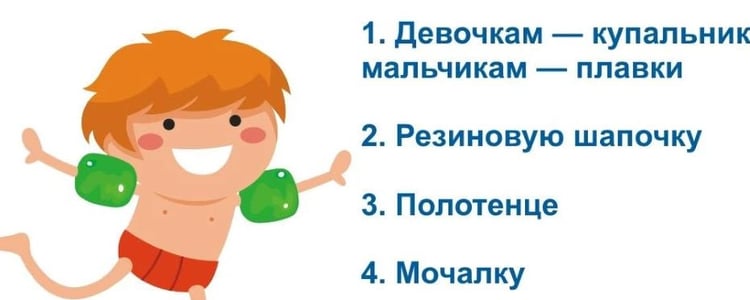 • девочкам — купальник, мальчикам — плавки;