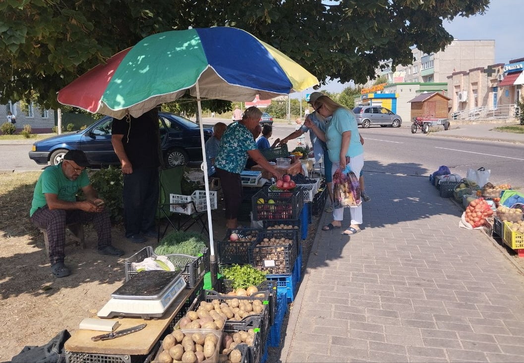 На мини-рынке только один предприниматель торгует овощами и фруктами, в то время как остальную продукцию предлагают дачники со своих участков.