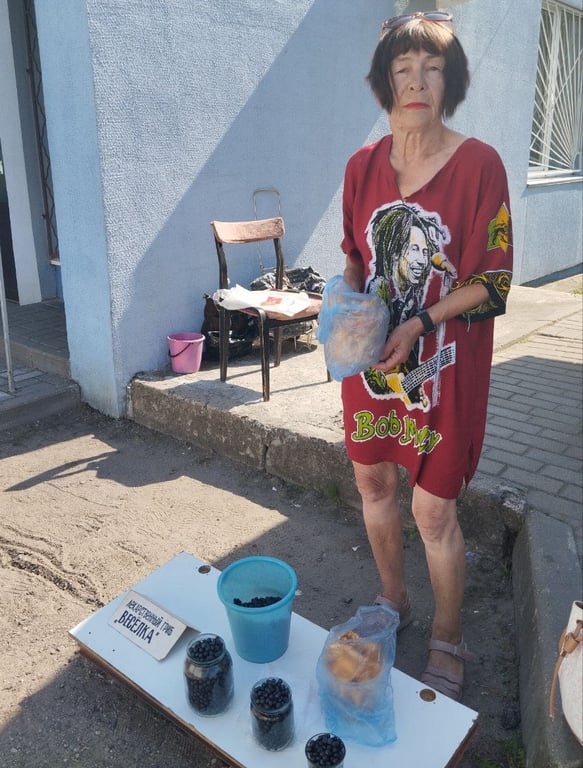 Одна женщина продавала чернику по 8 рублей за литр и лисички по 4 рубля. Она сетовала, что грибов в лесу уже нет из-за сильной засухи.