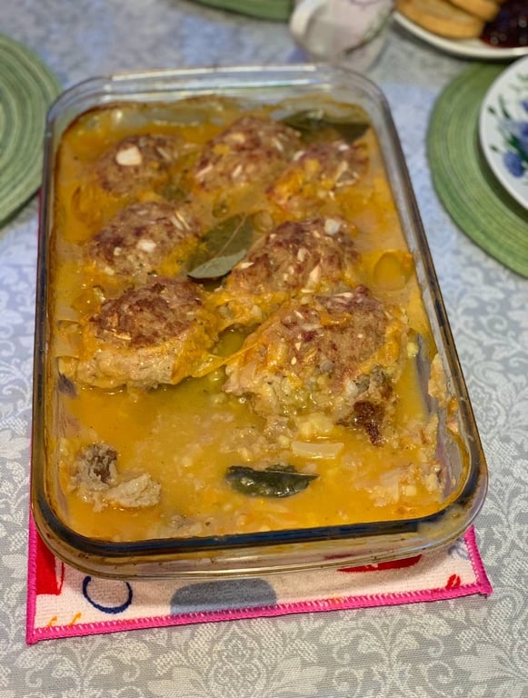 Часть зажарки кладем в форму, выкладываем голубцы, на них — оставшуюся часть зажарки и заливаем заливкой.