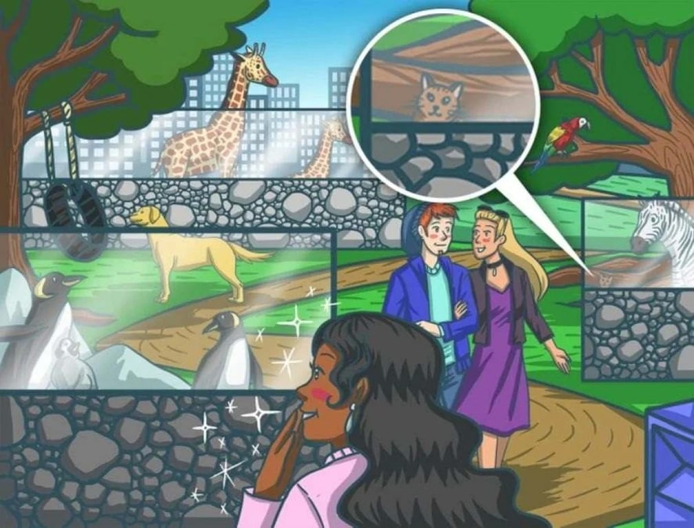 Взгляните внимательно на картинку. На первый взгляд перед вами разворачивается обычная сцена зоопарка с множеством животных, но среди этой яркой суеты кот искусно замаскировался, словно растворившись в окружении.