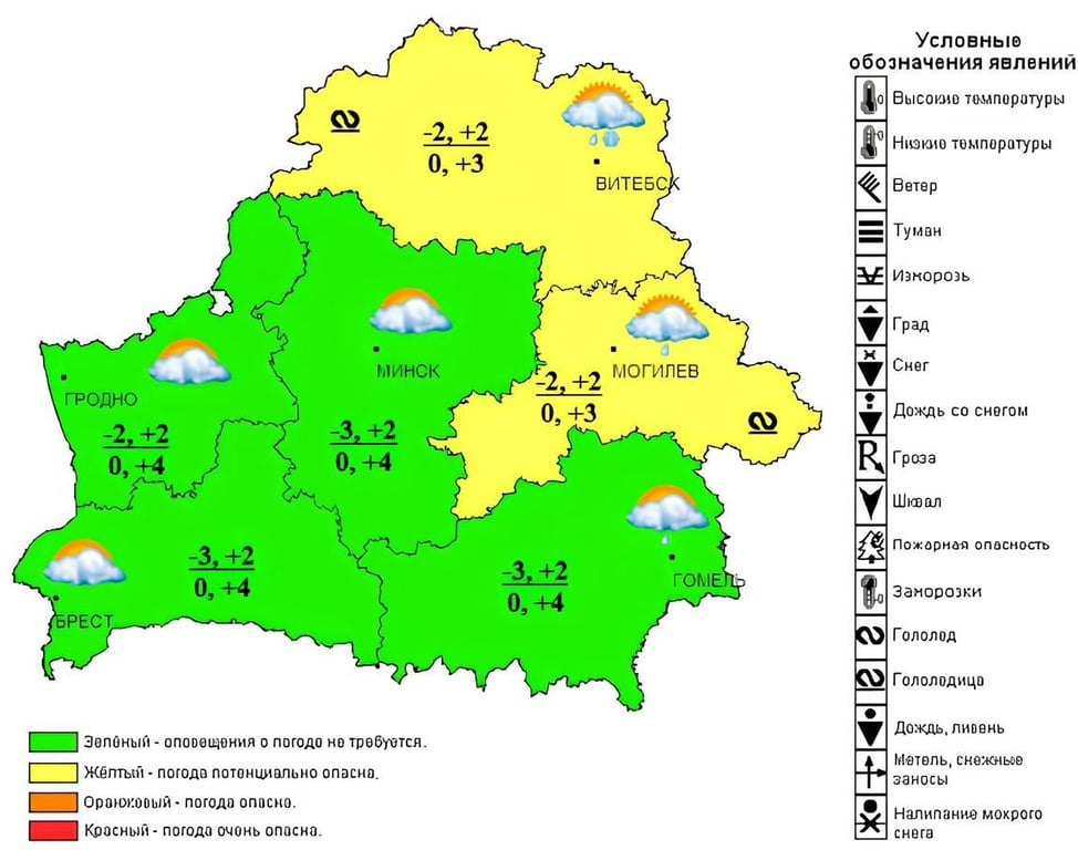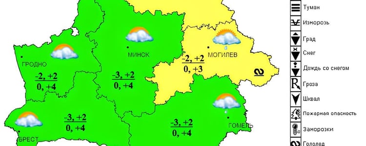 По г. Гродно: Преобладание облачной погоды. Ночью без существенных осадков (вероятность осадков 10-15%), днем небольшие осадки (мокрый снег, дождь) (вероятность осадков 70-80%). Ветер юго-западный, южный 4-9 м/с, днем порывы до 14 м/с. Температура воздуха минимальная ночью 0…+2°C, максимальная днем +2…+4°C.
