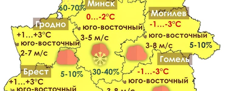 По Гродненской области: Облачно, днем с прояснениями. Ночью местами небольшой снег, днем преимущественно без осадков. На отдельных участках дорог гололедица. Ветер юго-восточный ночью 3-8 м/с, днем 5-10 м/с. Температура воздуха минимальная ночью -1…-6, максимальная днем -4…+1°C.