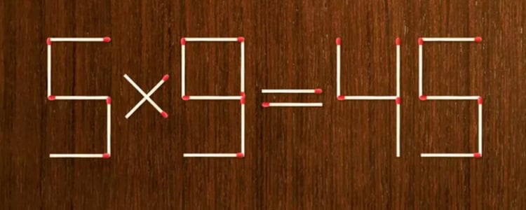 Правильный ответ: чтобы равенство стало верным, первую цифру 4 нужно превратить в 5, переложив спичку. А из цифры 6 убрать одну спичку, превратив ее в 5. Теперь у вас: «5×9=45». Логика победила!