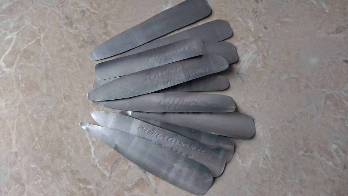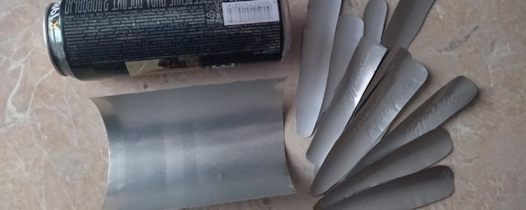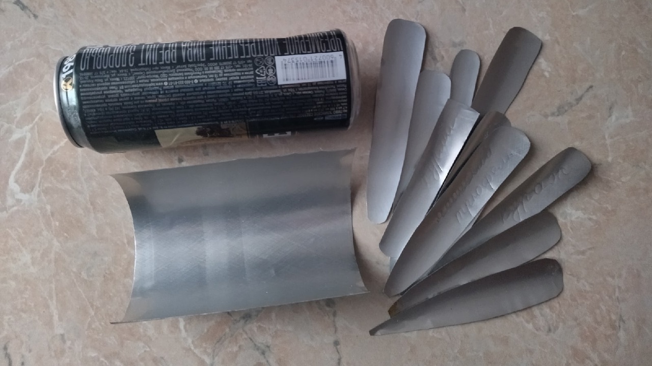 Понадобится жестяная банка из-под пива. У банки отрезаем верх и низ. Бирки нужной формы и размера вырезаем из средней части банки. Возможно, это будут бирки в виде прямоугольника размером 3 см на 10 см или бирки с острым концом.