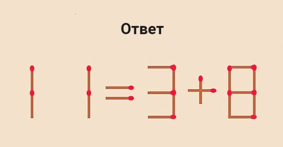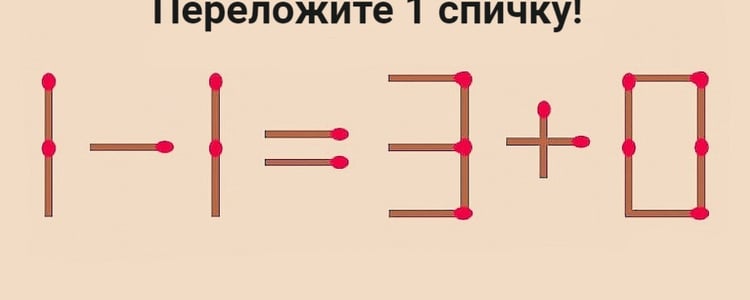 Для всех, кто хочет проверить и заодно повысить свой уровень IQ, предлагаем популярную головоломку со спичками. Готовы проверить себя? Для начала внимательно рассмотрите пример, а затем подумайте, какую спичку нужно переложить на другое место, чтобы получилось верное равенство. По условию передвигать можно только 1 спичку. А время на решение задачи — 10 секунд.
