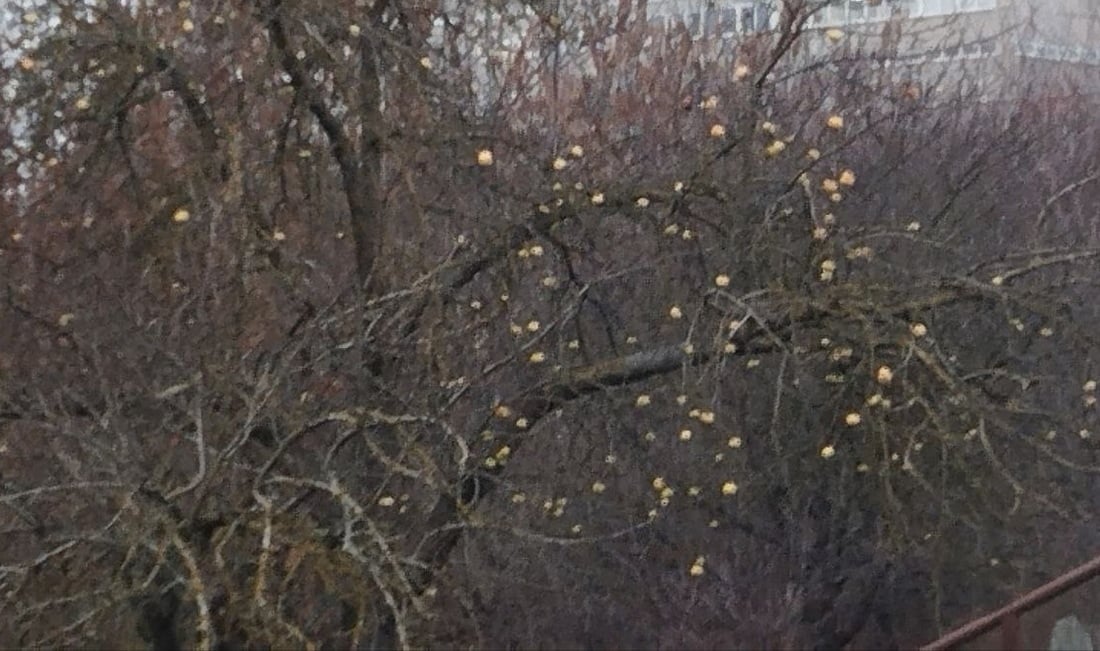 А на одной из яблонь всё еще висят яблоки, напоминая о тёплом декабре этого года.