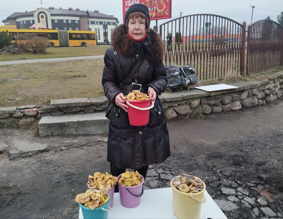 На мини-рынке на улице Брестской женщина продает несколько ведер грибов — зеленок и подзеленок. Трехлитровое ведро зеленок у нее стоит 12 рублей, а пятилитровое подзеленок — 15 рублей. Продавец Галина отмечает, что это, скорее всего, последние грибы в этом году.