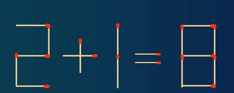 Возможно, эта задачка заставить некоторых попотеть. В примере 2 + 1 = 8 нужно переставить в другое место только 1 спичку, чтобы решение стало правильным. Если сможете это сделать за 10 секунд, можете считать себя гением.