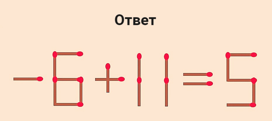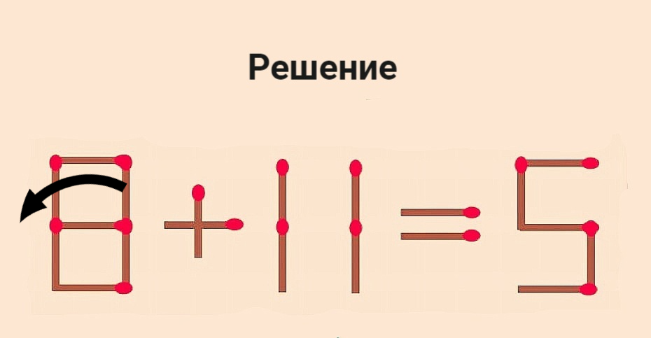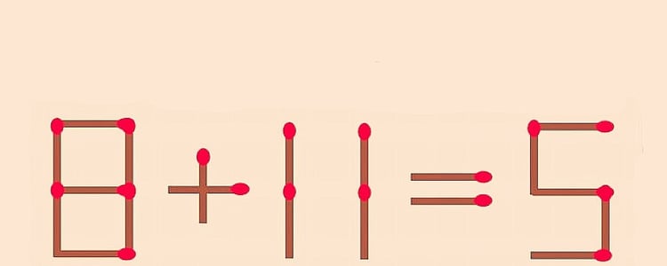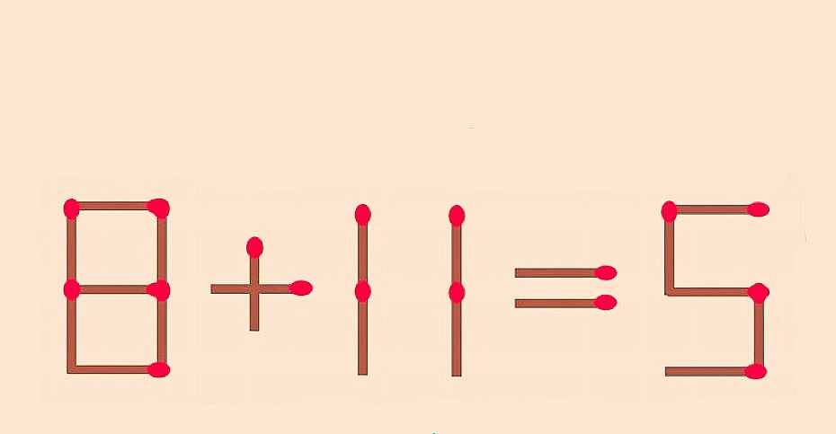 На изображении — задача, составленная с помощью спичек, но равенство не является верным: 8+11=5. Вам нужно переставить 1 спичку так, чтобы результат оказался верным. Подумайте немного, и вы обязательно найдете простое решение. Если же вам удастся раскусить хитрость этой головоломки за 12 секунд — вы гениальный человек!