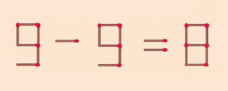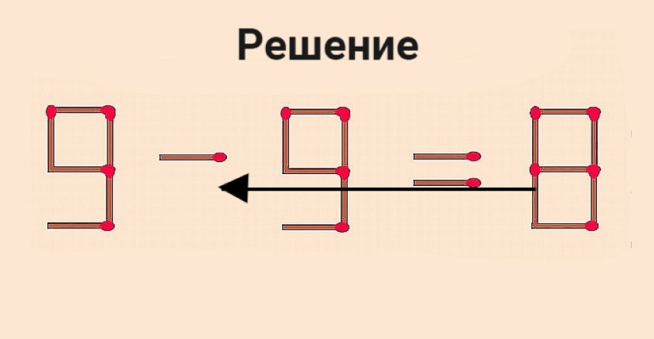Вопрос для знатоков: как переставить 1 спичку в уравнении 9–9=8, чтобы получить верное равенство? Головоломка предназначена для взрослых, включая бабушек и дедушек, чтобы снять стресс, улучшить концентрацию и мозговую деятельность. Головоломки могут быть решены в компании, используя настоящие спички.