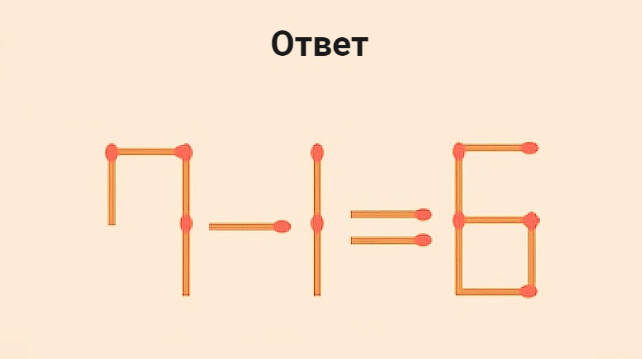 Сделайте пример 11-1=6 правильным, переложив на другое место в этом примере одну спичку. На решение отводится 12 секунд. Конечно, точное время совсем необязательно засекать. Наши головоломки — это просто минутка хорошего настроения и развития ума.
