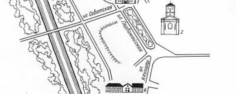 Слоним. Схема исторической части города: 1 — ратуша; 2 — костел бернардинок; 3 — костел бернардинцев; 4 — костел Св. Андрея; 5 — синагога; 6 — жилая застройка. Источник: В. Чантурия «История архитектуры» (изд. 1977 г.)