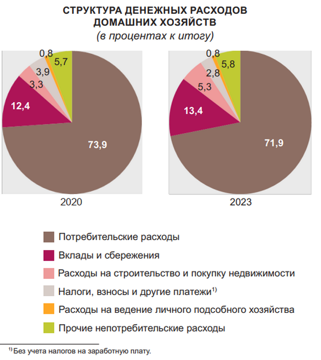 Вклады и сбережения занимали в структуре расходов 13,4% в 2023 году (ранее – 12,4%), расходына строительство и покупку недвижимости – 5,3% (ранее – 3,3%).