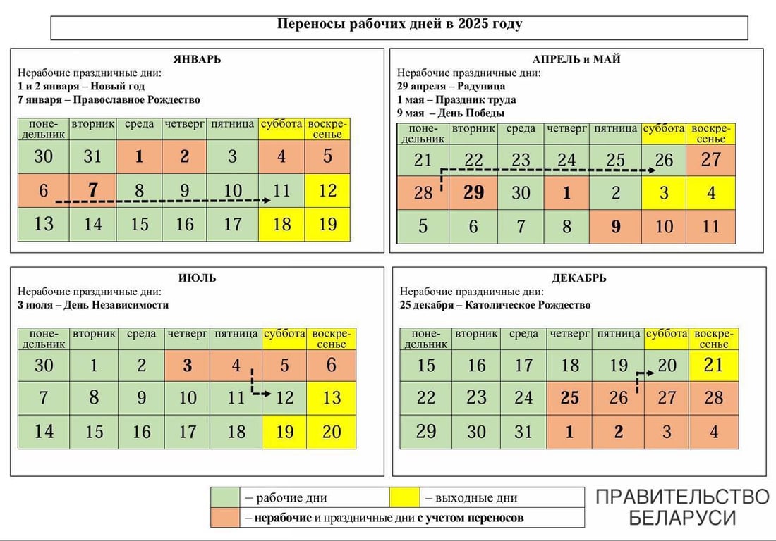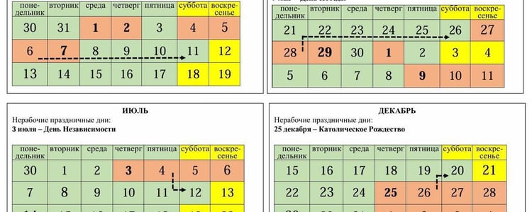 ✔️с понедельника 6 января на субботу 11 января (отдыхаем четыре дня подряд на православное Рождество — 4, 5, 6 и 7 января); ✔️с понедельника 28 апреля на субботу 26 апреля (отдыхаем три дня подряд на Радуницу — 27, 28 и 29 апреля); ✔️с пятницы 4 июля на субботу 12 июля (отдыхаем четыре дня подряд на на День Независимости — 3, 4, 5 и 6 июля); ✔️с пятницы 26 декабря на субботу 20 декабря (отдыхаем четыре дня подряд на католическое Рождество — 25, 26, 27 и 28 декабря).