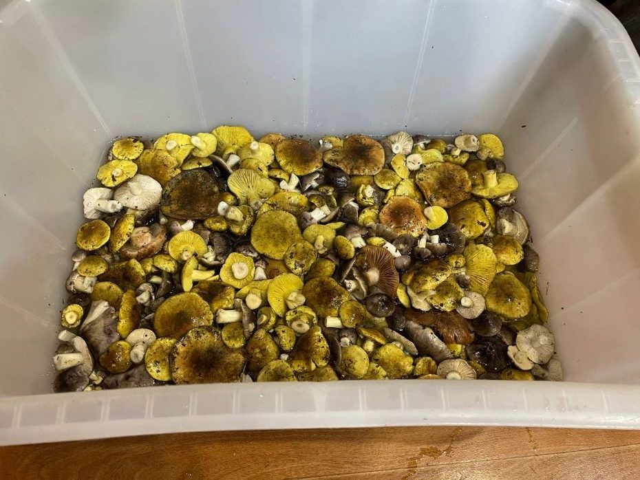Наполняем корзину наполовину грибами — и окунаем несколько раз ее в ручей. Проточная вода быстро вымоет песок и хвоинки. Так делаем, пока не перемоем все грибы. Бояться того, что вода в реке может быть грязной, не стоит. Грибы все равно потом проходят довольно длительную термическую обработку.