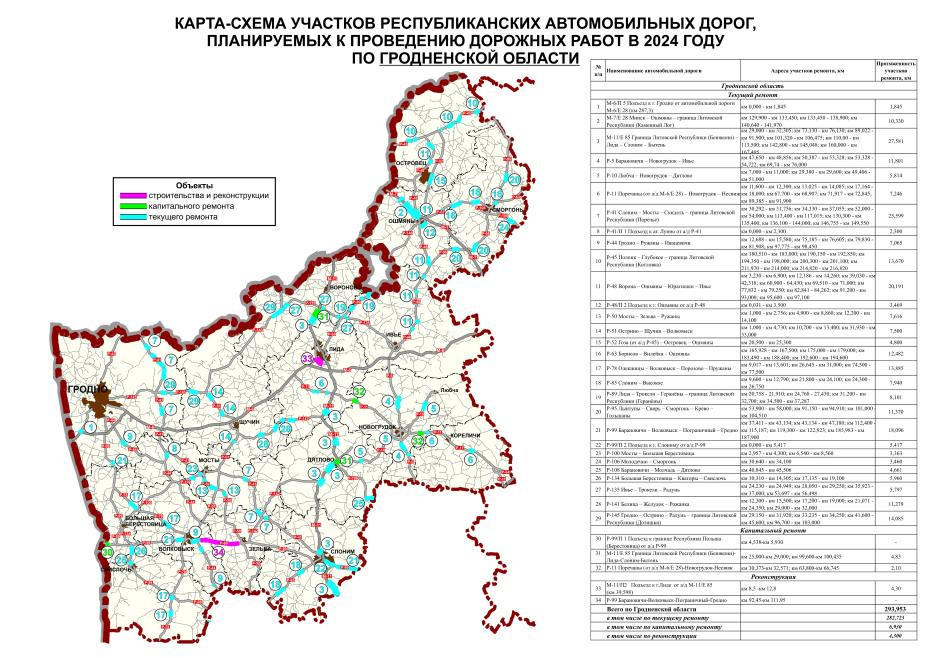 Минтранс опубликовал карту-схему участков республиканских и автомобильных дорог, которые будут отремонтированы в этом году в Гродненской области. Посмотрели, какие дороги в Слонимском районе попали в планы по ремонту.