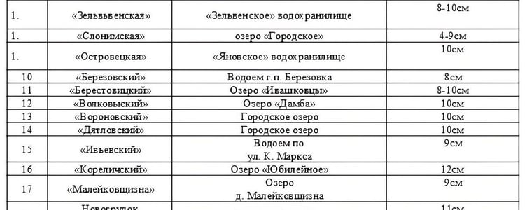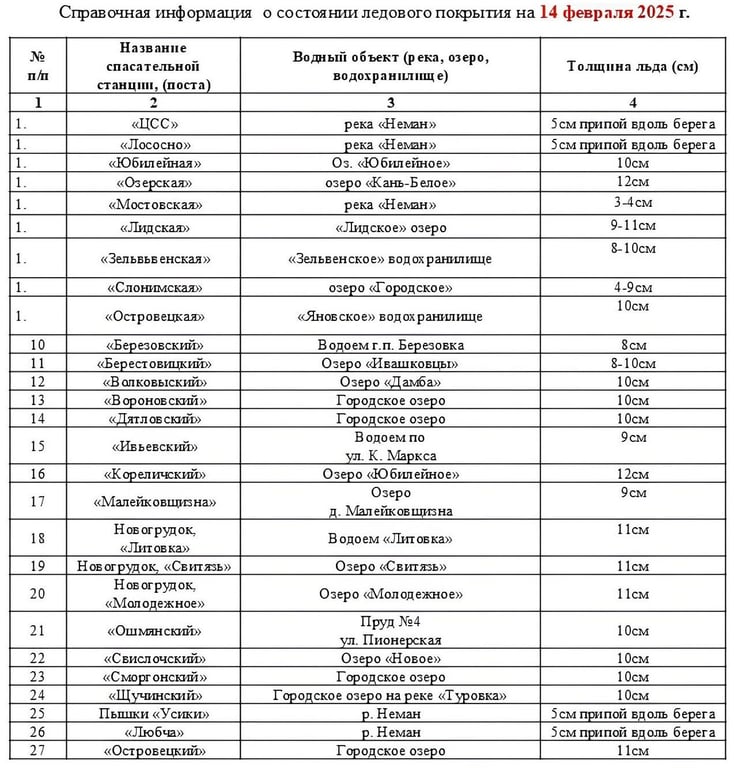 На озерах толщина льда составляет от 9 до 12 см. Самый толстый слой льда образовался на озере Кань-Белое в Гродненском районе и Юбилейном в Кореличском районе — 12 см.