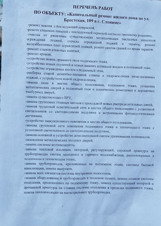 В Слониме начался капитальный ремонт девятиэтажного жилого дома, расположенного по улице Брестской, 109. Дому, которому более тридцати лет и который имеет два подъезда, предстоит серьёзное обновление согласно списку, предоставленному Слонимским ЖКХ.
