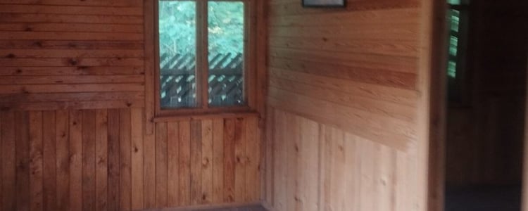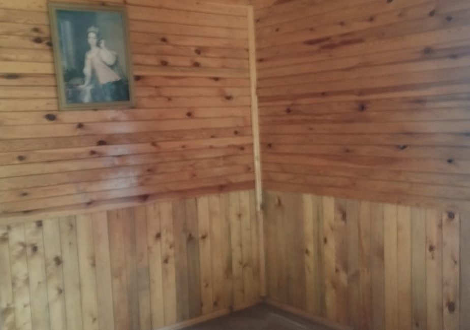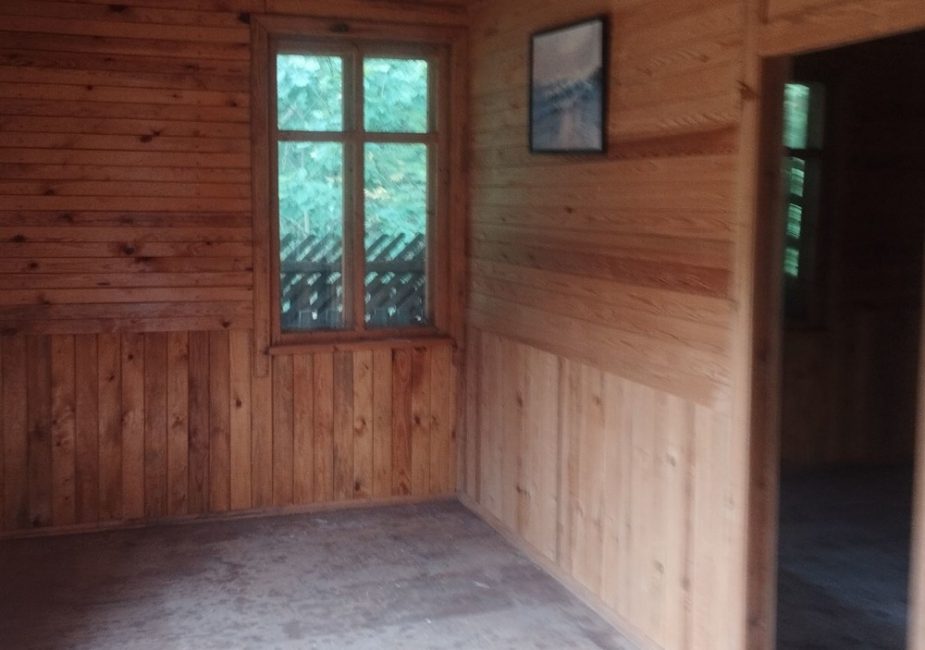 Площадь домика — почти 35 квадратных метров. Его внутренняя отделка выполнена из дерева — обшивка дощечкой.