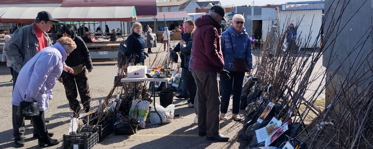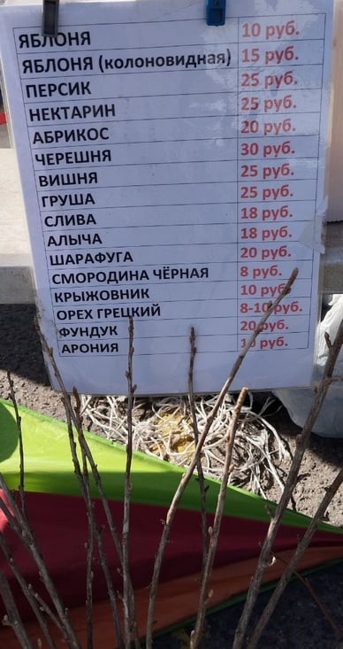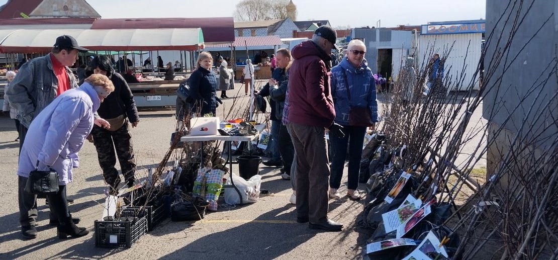 На рынке появились в продаже саженцы, которые привезли фермерами из Лиды. Саженцы яблонь продают по 10 – 15 рублей, нектарина и персика – по 25 рублей, абрикоса – по 20 рублей, черешни – по 30 рублей, вишни – по 25 рублей, груши – по 25 рублей, сливы – по 18 рублей, крыжовника – по 10 рублей, смородины черной – по 8 рублей.