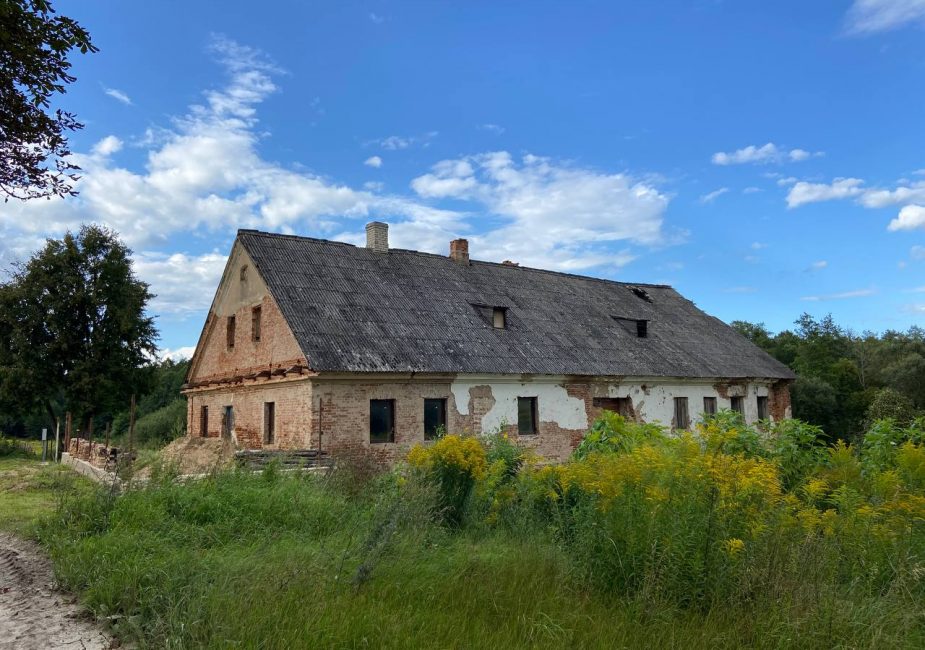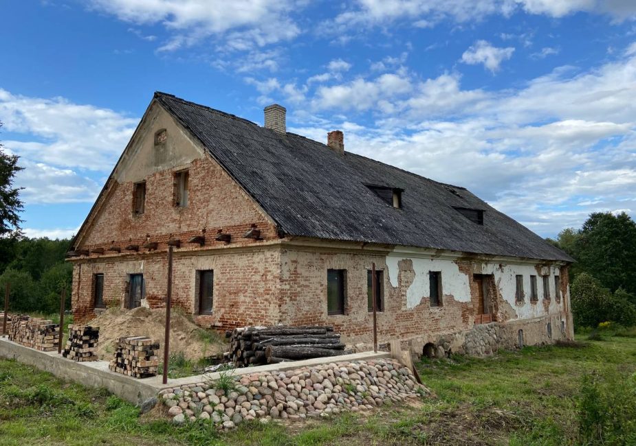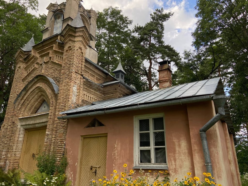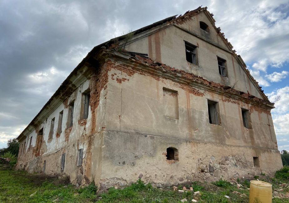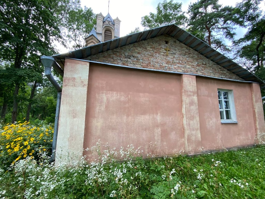 Попасть внутрь нам не удалось. Увидели только заросший парк и хозяйственную постройку. В ней вставлены пластиковые окна, идет строительство ограждения.