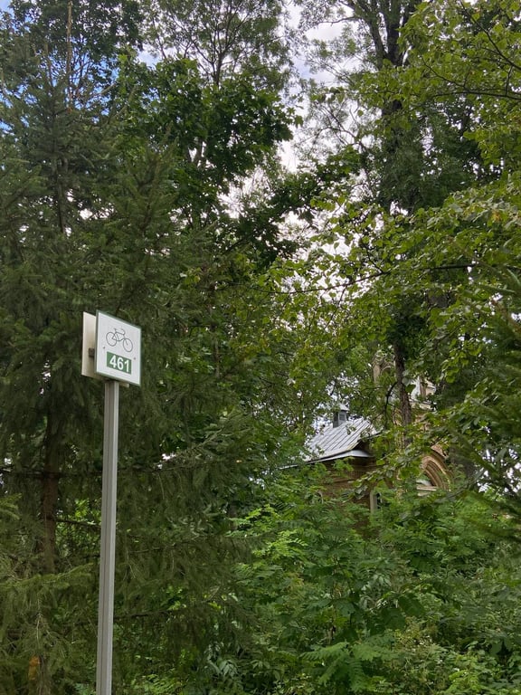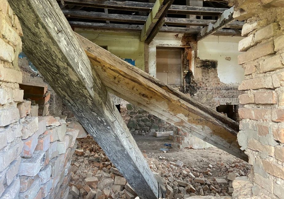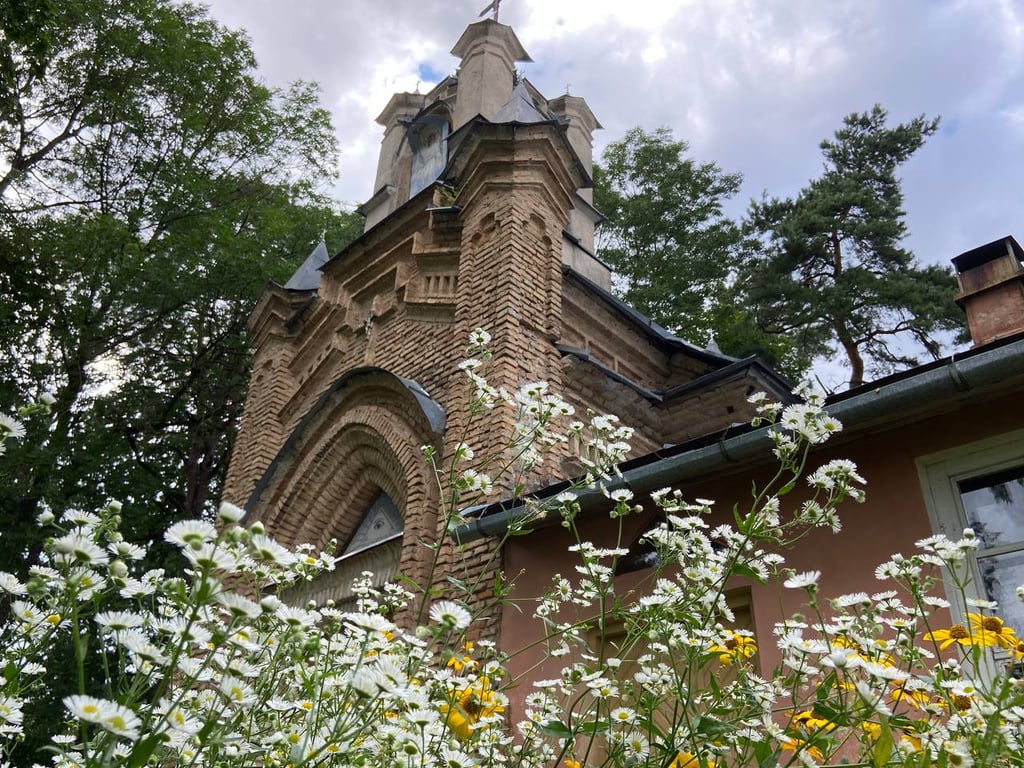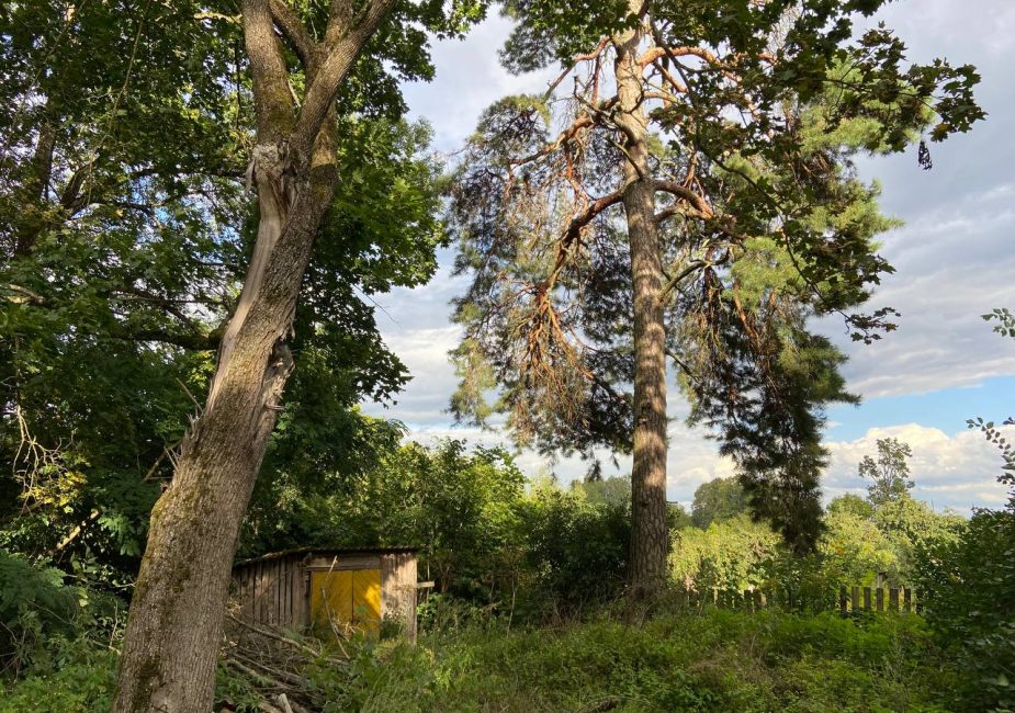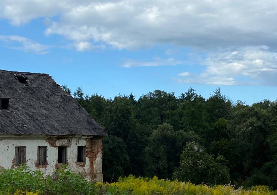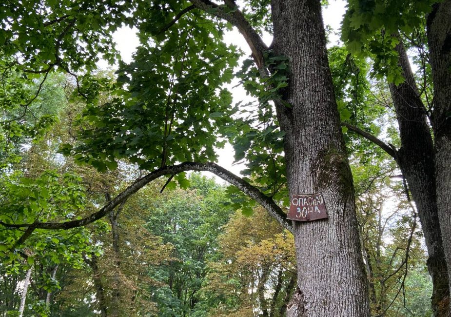 Попасть внутрь нам не удалось. Увидели только заросший парк и хозяйственную постройку. В ней вставлены пластиковые окна, идет строительство ограждения.