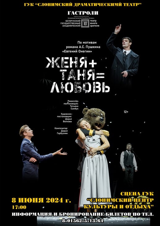 От всей души приглашаем вас 8 июня в 17:00 в Слонимский центр культуры и отдыха на наш совершенно потрясающий спектакль «Женя + Таня = любовь». Эта постановка, созданная по мотивам романа Александра Сергеевича Пушкина «Евгений Онегин» и воплощённая в жизнь талантливой московской режиссёром Татьяной Самбук, обещает быть незабываемой. Поверьте, вы получите истинное удовольствие и проживете невероятные эмоции.