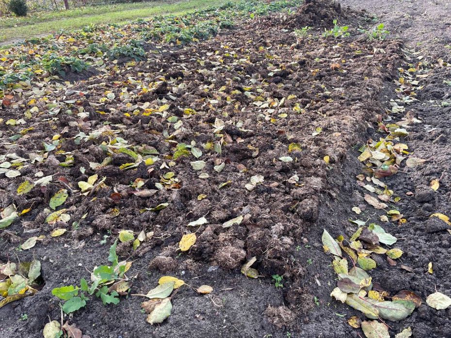 Все дело в том, что каждую осень после посадки чеснока свекровь мульчировала чеснок. Я тоже это делала: например, засыпала грядки с озимым чесноком опилками, листьями, хвойным опадом. А свекровь, в свою очередь, укрывала грядку всегда навозом. Она раскидывала навозную крошку по грядке с чесноком небольшим слоем, примерно в 3 сантиметра.