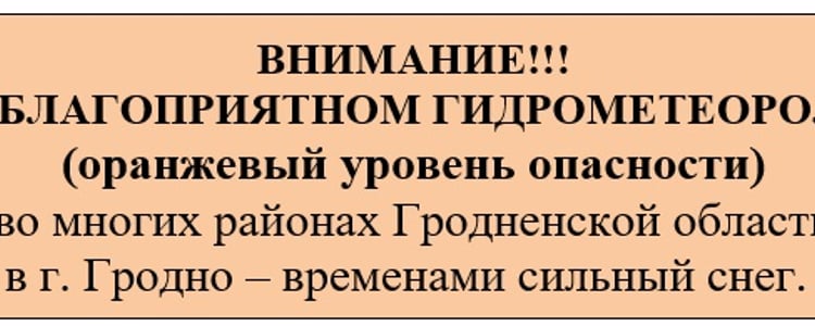 По г. Гродно: Облачно, ночью с прояснениями. Ночью небольшой снег (вероятность осадков 70-80%). Днем снег, мокрый снег, временами сильный снег (вероятность осадков более 90%), слабая метель. Слабые туман и гололед. На отдельных участках дорог гололедица. Ветер ночью юго-западный 4-9 м/с, днем переменных направлений 5-10 м/с, порывы до 14 м/с. Температура воздуха минимальная ночью -4…-6°С, максимальная днем около 0°С.