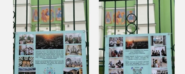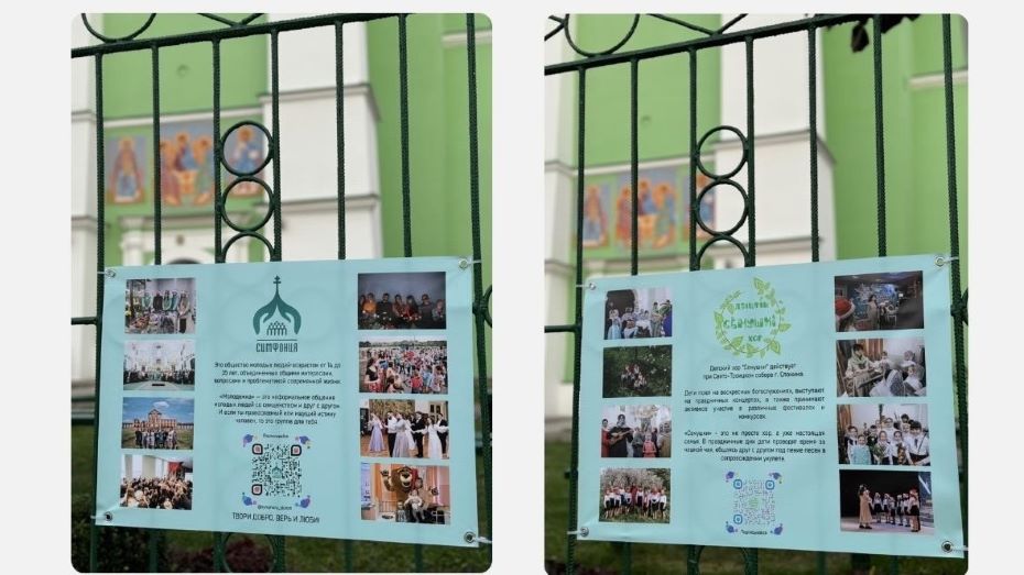 Баннеры информируют о деятельности прихода, обществе молодых людей «Симфония», детском хоре «Семушки», которые действуют при храме и др.