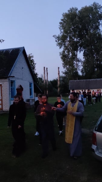 Участники молодежного слета прошли крестным ходом от епархиального центра д. Низ к храму великомученика Георгия Победоносца д. Поречье (около 8 км), где приняли участие в ночной Божественной литургии, исповедовались и причастились Святых Христовых Таин.