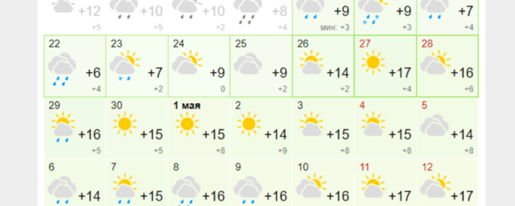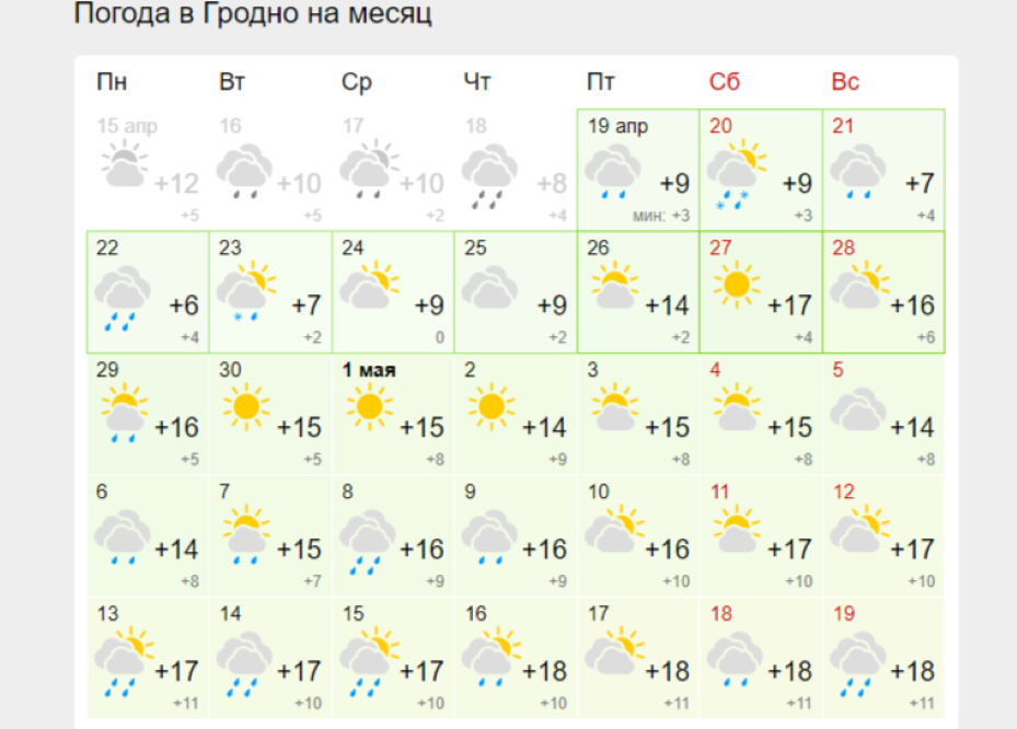 Судя по прогнозу gismeteo.by, черемуховые холода прочно обосновались на Гродненщине. Немного потеплеет лишь к концу следующей недели. А в три первые декады мая температура воздуха не будет превышать +20°С.