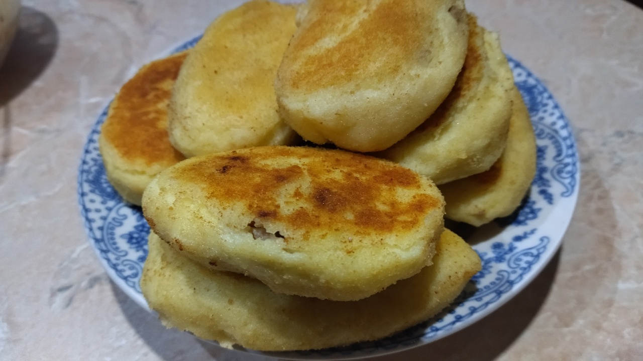1 кг картофеля; 2 яйца; 4-5 ст. л. муки; 0,3-0,5 кг фарша; 1 луковица; соль и перец – по вкусу; растительное масло – для жарки.