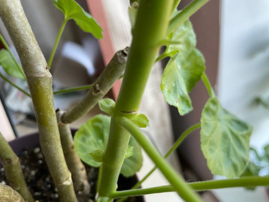 У пеларгоний часто можно наблюдать длинные, оголенные снизу стволики — со временем листья стареют и опадают. На их месте образуется шрамики, где и находятся спящие почки. При обрезке стволика спящие почки просыпаются, и все питание начинает поступать именно к ним. На этом месте начинает расти новый побег.