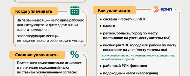 Подоходный налог уплачивает физическое лицо — собственник жилого помещения, получающий доход от сдачи. Налог необходимо уплатить независимо от наличия или отсутствия договора найма жилого помещения.