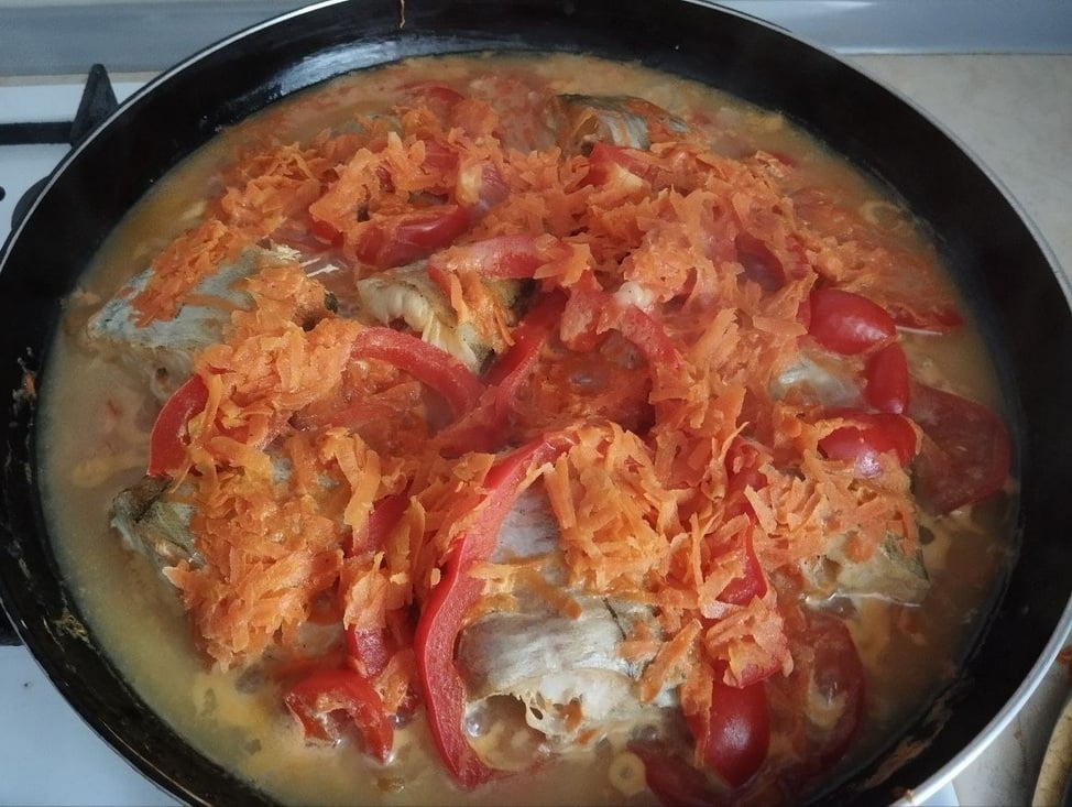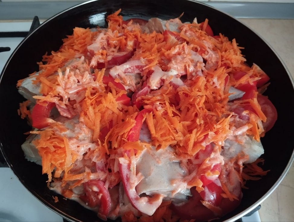 Поверх рыбы добавьте оставшуюся морковь и болгарский перец.