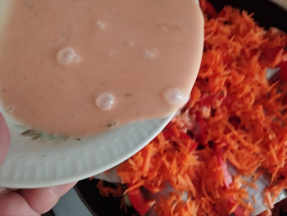 Все ингредиенты залейте заливкой, приготовленной из сметаны, томатной пасты, воды, соли и специй.